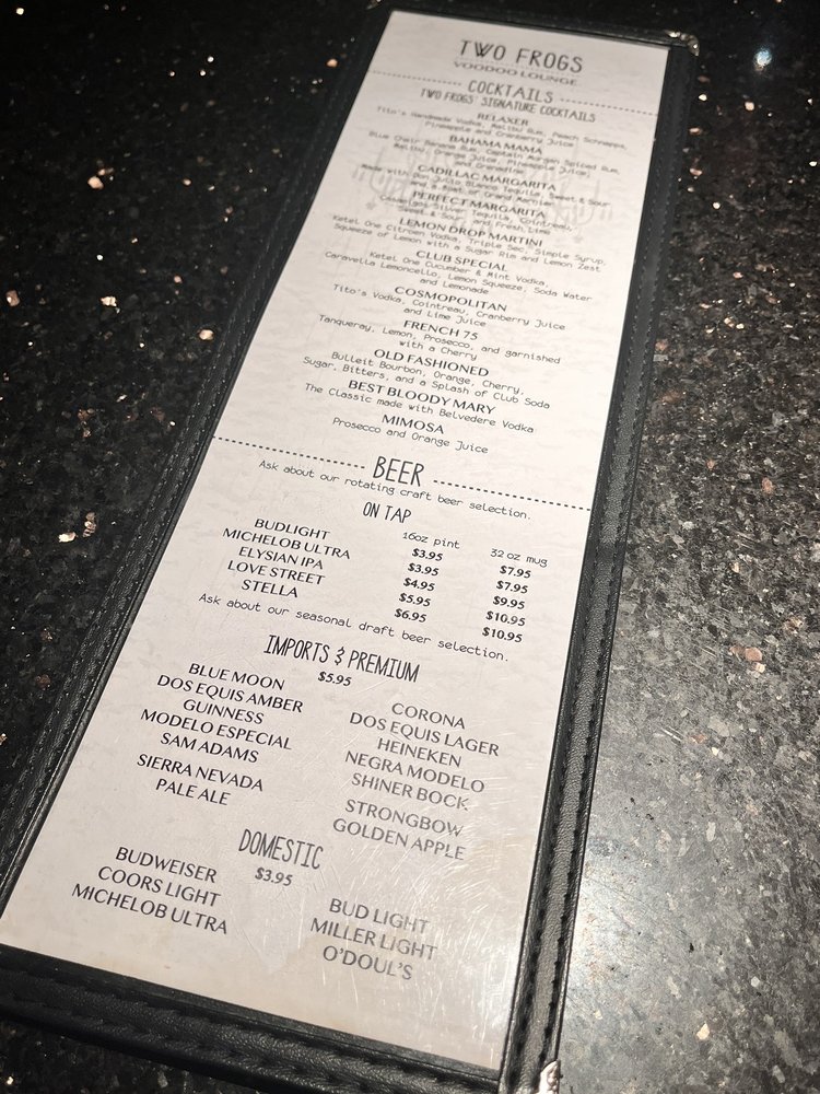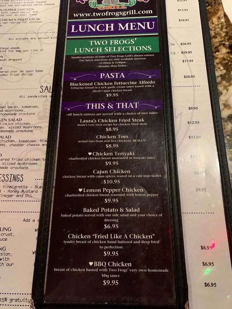 - Wide Range of Services: Two Frogs Grill accommodates reservations, takeout, and delivery, while also being wheelchair accessible.